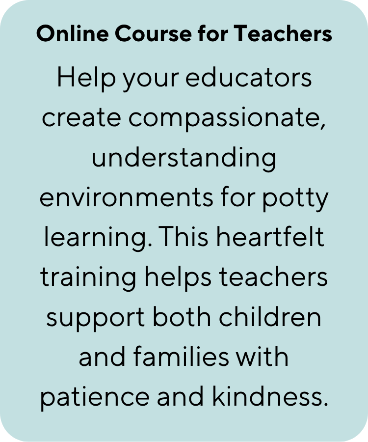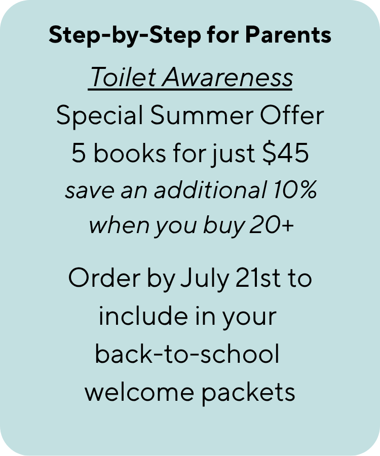 Educators and Administrators, we have resources to aid you in supporting your families. This summer we are offering a special discount on bulk Toilet Awareness books. Order now and get them in time for your New Family Welcome Packets! We also can help you get your whole team ready to start the year on the same potty learning page. Check out out Potty Learning in Schools online course.